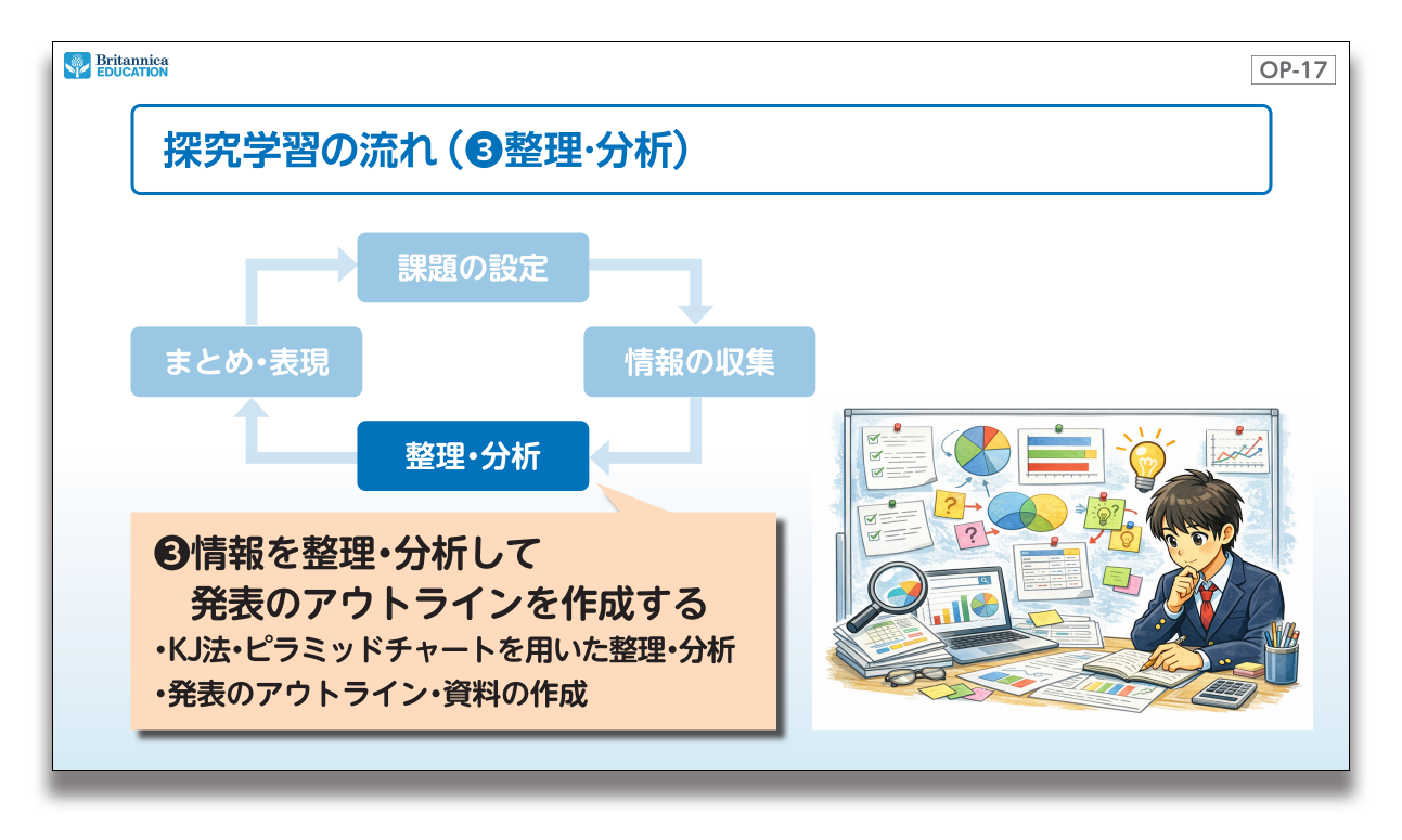 信頼性の高いブリタニカのデータベースと、探究学習を支援する教材・評価ツールを組み合わせることで、「問いを立てる」段階から「調査・整理・発表」まで、探究学習のプロセスを一貫してサポートします。